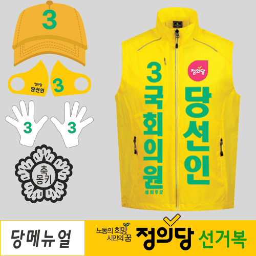 - 정의당 유세 문구인쇄 선거조끼 4종 세트(조끼·모자·장갑·마스크)